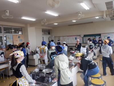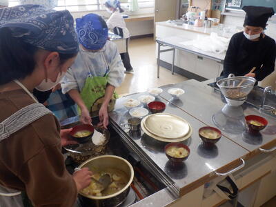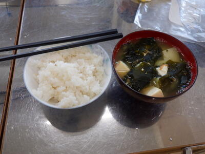 ご飯とみそ汁の調理実習です。「野寺田んぼ」でお世話になった地域の方をお招きし、野寺小産のお米を味わいました。もちもちとした食感でとてもおいしかったです。みそ汁も出汁のうま味が濃く、おいしくいただきました。