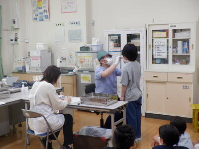 歯科検診を行いました。静かに並んで順番を待つことができました。