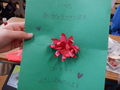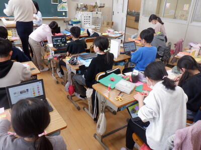 4年生の教室では、素敵なメッセージカードを作っていました。とび出す仕掛けをパソコンで調べながら工夫していました。カードをもらった人も喜ぶことでしょうね。
