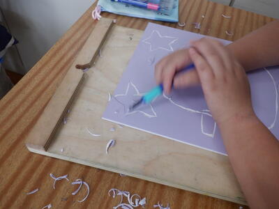 彫刻刀を使って、版木を彫っていました。ケガをしないように慎重に彫り進めていました。