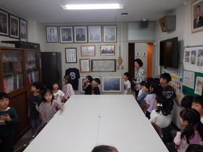1年生の声が聞こえてきたので、校長室の扉を開けて中に入ってもらいました。